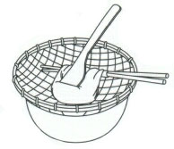 (6)木箱にこし布を広げ、穴のあいたお玉ですくい入れる。